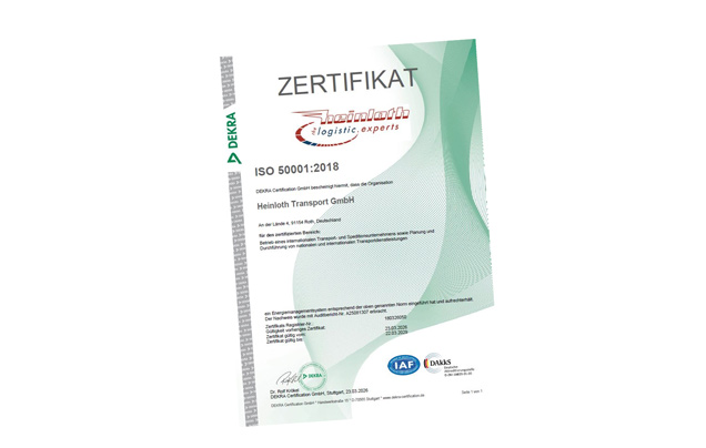 Die Heinloth Transport GmbH hat ihr Energiemanagementsystem erfolgreich nach ISO 50001 zertifizieren lassen und setzt damit ein klares Zeichen für ein systematisches und nachhaltiges Energiemanagement. Mit der international anerkannten Norm verpflichtet sich HEINLOTH, die Energieeffizienz kontinuierlich zu verbessern, den Energieverbrauch zu senken und die Umweltbelastung nachhaltig zu reduzieren.